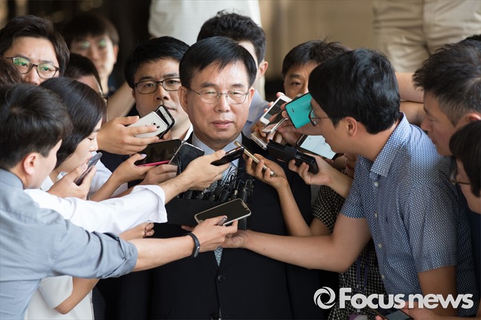 (서울=포커스뉴스) 법인세 등 부정 환급 의혹을 받고 있는 허수영 롯데케미칼 사장이 11일 오전 서울 서초구 서울중앙지검으로 출석해 취재진의 질문에 답하고 있다.