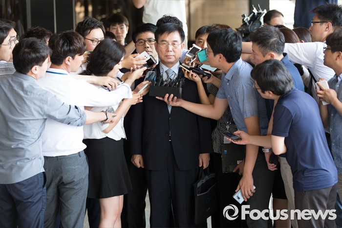 (서울=포커스뉴스) 법인세 등 부정 환급 의혹을 받고 있는 허수영 롯데케미칼 사장이 11일 오전 서울 서초구 서울중앙지검으로 출석해 취재진의 질문을 받고 있다.