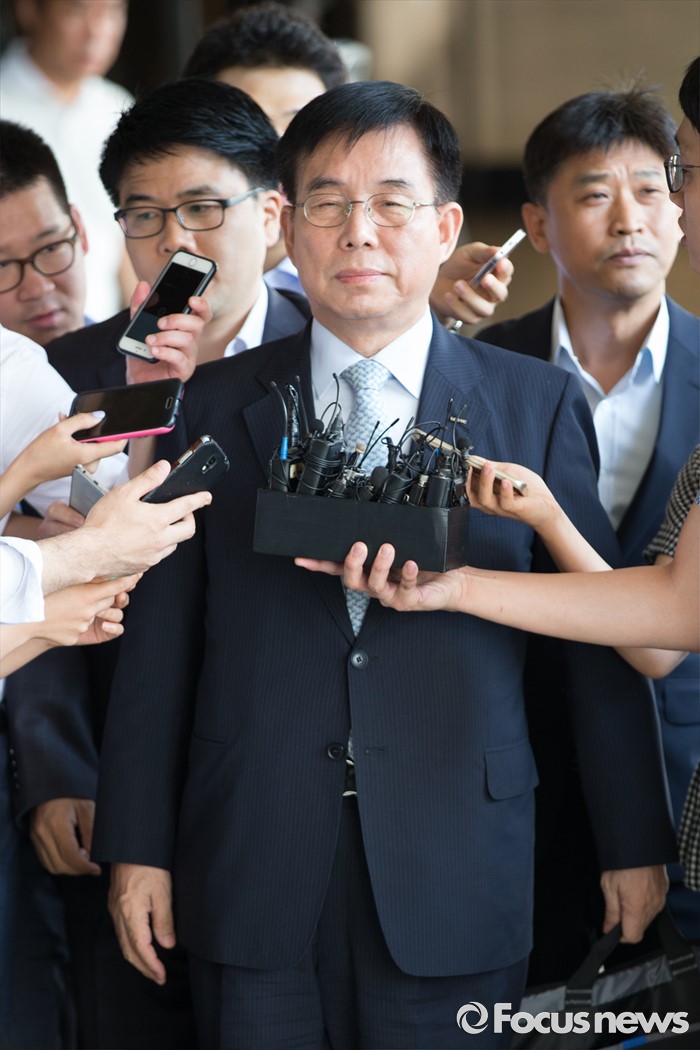 (서울=포커스뉴스) 법인세 등 부정 환급 의혹을 받고 있는 허수영 롯데케미칼 사장이 11일 오전 서울 서초구 서울중앙지검으로 출석해 취재진의 질문을 받고 있다.
