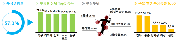 주요 부상 부위는 발목(25.4%), 무릎(23.1%), 상반신(20.1%) 순이었으며, 부상 종류는 염좌(51.7%), 통증(51.0%), 찰과상(21.6%) 순이었다.