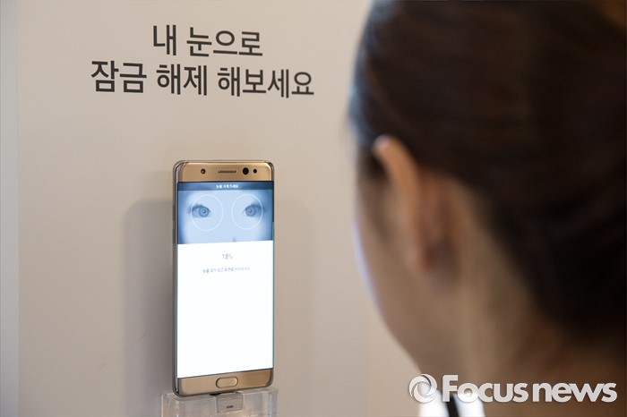 (서울=포커스뉴스) 11일 오전 서울 서초구 삼성전자 사옥에서 열린 '갤럭시 노트7 출시 미디어 행사'에서 관계자들이 홍채 인식 기능을 선보이고 있다.