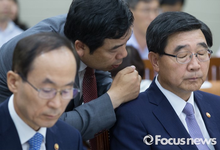 (서울=포커스뉴스) 11일 오후 서울 여의도 국회에서 열린 환경노동위원회 전체회의에 참석한 이기권(오른쪽) 고용노동부 장관이 관계자로부터 보고를 받고 있다. 왼쪽은 윤성규 환경부 장관.
