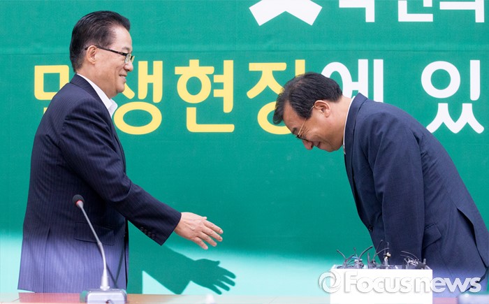 (서울=포커스뉴스) 11일 오후 서울 여의도 국회에서 박지원(왼쪽) 국민의당 비상대책위원장이 이정현 새누리당 대표와의 면담에 앞서 인사하고 있다.