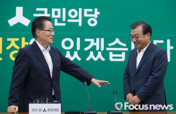 (서울=포커스뉴스) 11일 오후 서울 여의도 국회에서 박지원(왼쪽) 국민의당 비상대책위원장이 이정현 새누리당 대표와의 면담에 앞서 인사하고 있다.