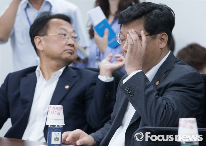 (서울=포커스뉴스) 11일 오후 서울 여의도 국회에서 열린 전기세 누진제 개편 긴급 당정 협의에 참석한 유일호(왼쪽) 경제부총리 겸 기획재정부 장관과 주형환 산업통상자원부 장관이 회의 준비를 하고 있다.