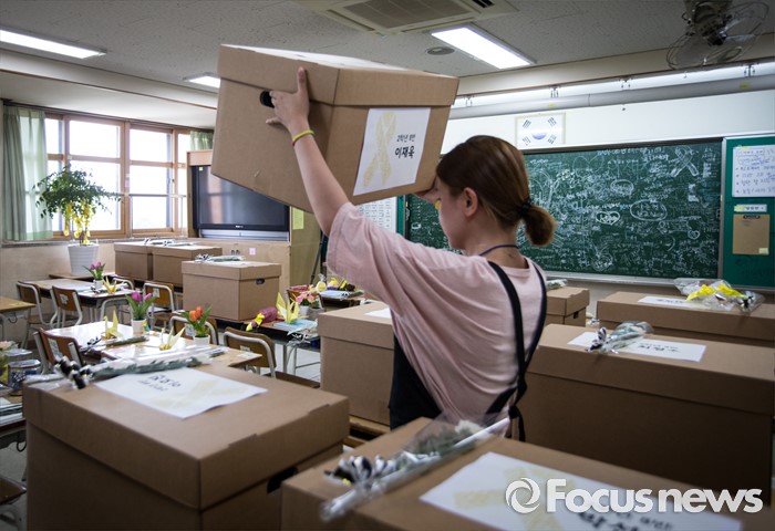 (안산=포커스뉴스) 세월호 참사에서 희생된 단원고등학교 학생들의 교실 이전 절차가 진행 중인 11일 오전, 경기도 안산시 단원고등학교 기억교실에서 한 유가족이 책상에 있는 유품을 수습하기 위해 유품상자를 옮기고 있다.