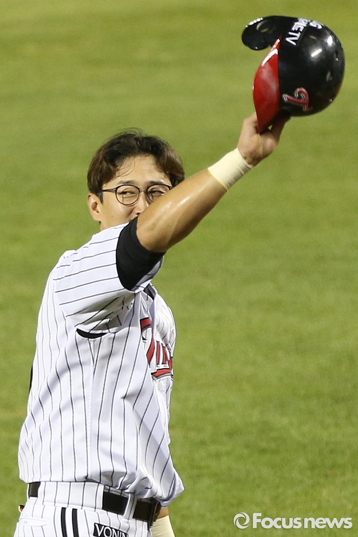 (서울=포커스뉴스) 11일 서울 잠실구장에서 열린 2016 프로야구 NC-LG 경기에서 KBO리그 통산 6번쨰 2천 안타를 기록한 LG 박용택이 꽃다발 전달식을 가진후 관중석을 돌아보며 헬멧을 벗어 인사하고 있다.