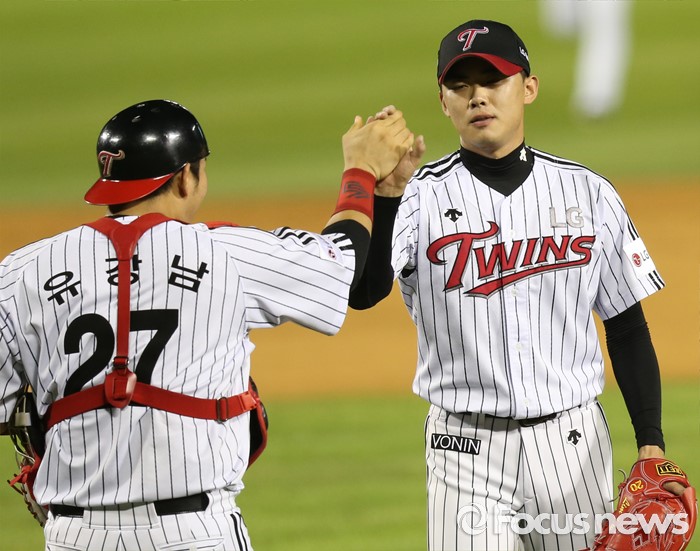 (서울=포커스뉴스) 11일 서울 잠실구장에서 열린 2016 프로야구 NC-LG 경기에서 NC에 4-2로 승리해 8연승을 한 LG 마무리투수 임정우와 포수 유강남이 손을 맞잡으며 기쁨을 함께하고 있다.