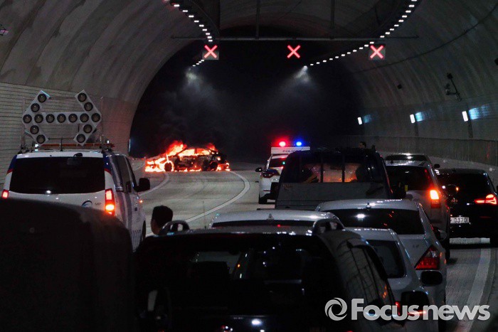 11일 오후 6시 10분쯤 서울 서초구 강남순환도로 사당 IC 방면 서초터널에서 주행 중이던 승용차에 화재사고가 발생 차량운행이 한때 중단되고 있다. 운전자 안모씨와 동승자 김모씨가 승용차를 정차시키지 못한 채 뛰어내렸고, 곧바로 병원에 이송됐다. <사진제공=김건수사진가>