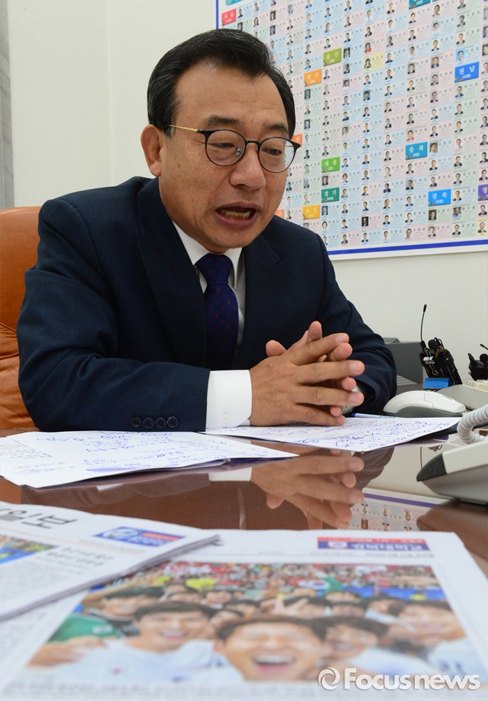 (서울=포커스뉴스) 이정현 새누리당 대표가 12일 오전 서울 여의도 국회 당대표실에서 정몽규 리우올림픽 선수단장과 격려 통화를 하고 있다.